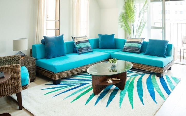 家具がレイアウトできたら、次にリゾート感を高めるためのカラーコーディネートを行います。ソファカバーだけでなく、周辺のクッション・ラグ・壁面装飾なども追加してバランス良く色付けをしていきます。