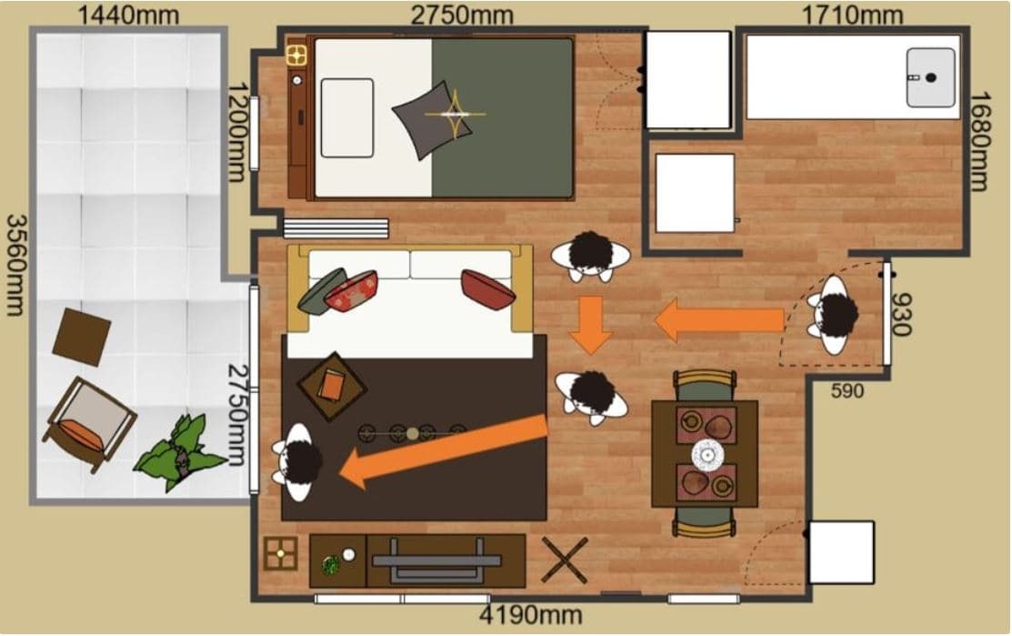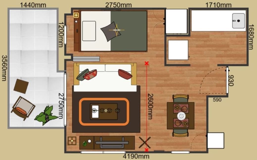 ソファの前に幅800mmのローテーブルを置いた一般的なレイアウト。置くことは出来ますが、ソファ後ろからテレビボードの壁まで、2600mmの空間であるため、少し窮屈な印象です。