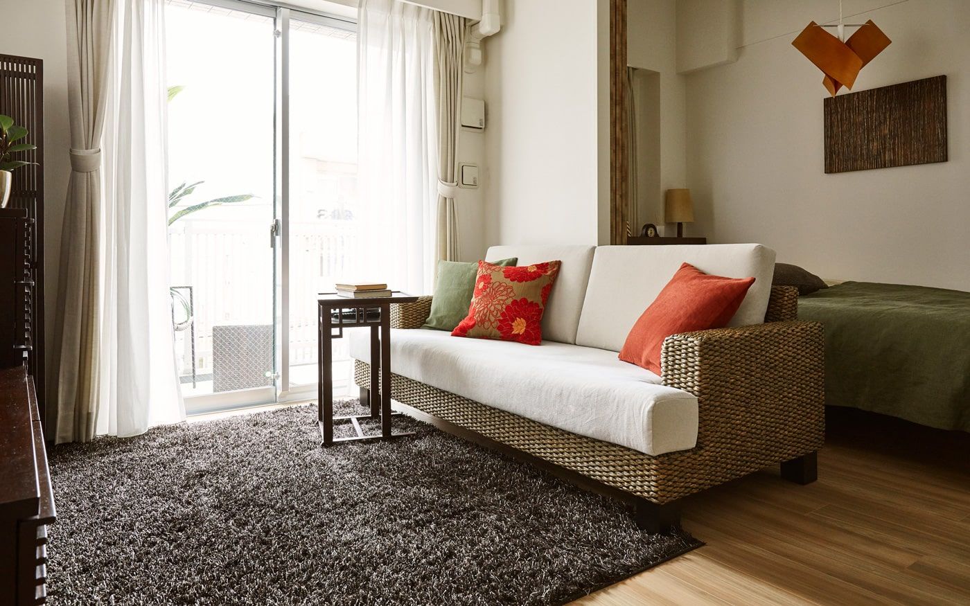 ハワイらしい雰囲気を演出できる自然素材の家具を配置していきます。一人暮らし・1LDKの部屋でも広々と使えるよう、レイアウトにも気を配ります。