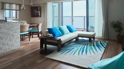 アイランドカラーズ・スタイル~うつろう時に満たされる~のページです。沖縄の透明な海を思わせるターコイズブルーを基調にしたアイランドブルー・スタイルの部屋づくりでは、澄んだブルーやグレーのクッションカバー、ガラス天板のローテーブルや帆船をモチーフにした家具で海の開放感を表現します。リビングから屋外のルーフテラスまで、コバルトブルーやパステルブルーを含む様々なブルーを活用し、シンボルツリーでリゾート感を加える。エメラルドグリーンを取り入れたセカンドリビングや、ターコイズブルーを中心とした落ち着いた寝室も、アイランドリゾートの雰囲気を演出します。