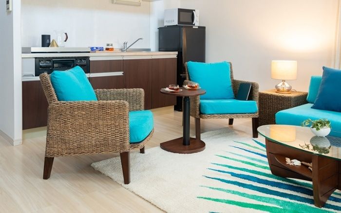 パーム柄が大胆に描かれたラグが印象的なリビング。ソファやダイニングチェア、ビーズクッションにラグと統一感のあるブルーを取り入れ、自然の海を感じる美しいコーディネートです。