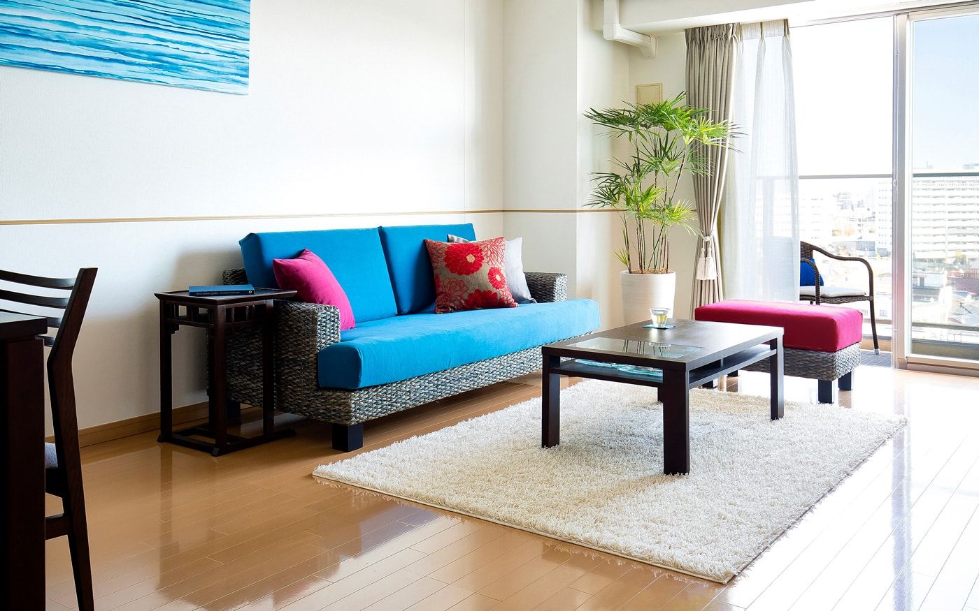 こちらのインテリア実例は、沖縄らしい色鮮やかなブルーとレッドを配色したリゾート感溢れる部屋です。リビングダイニングの印象を大きく変えている、海を連想させるようなアートパネルを中心にブルーで彩られた家具が相性よくレイアウトされています。