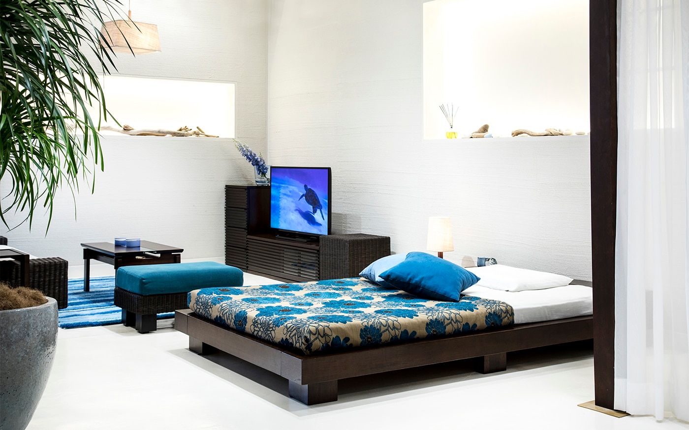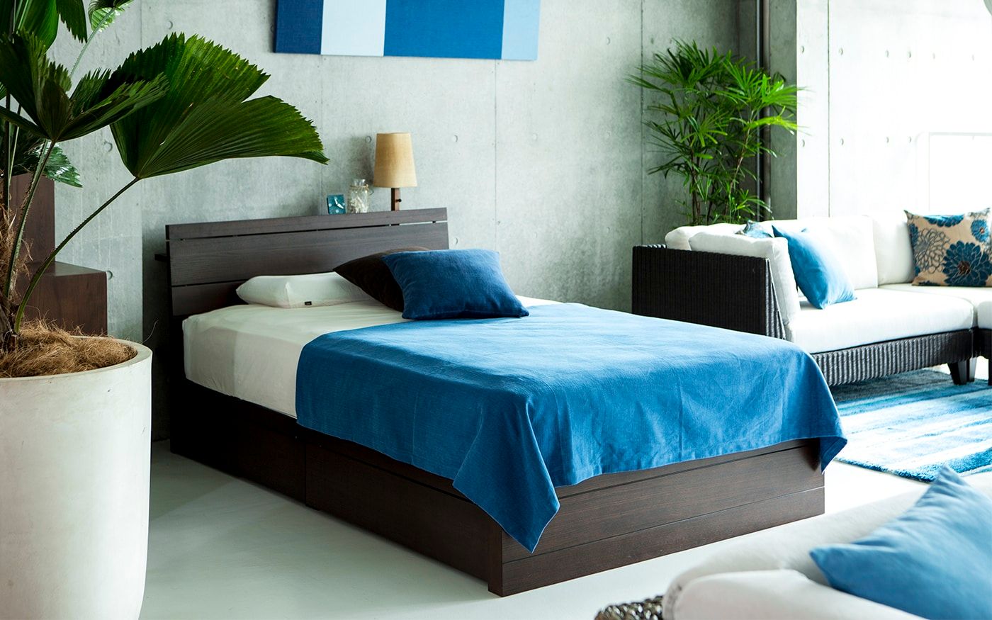 アイランドブルー・スタイルをイメージした寝室にはゆとりのあるQサイズのローベッドを主役にレイアウトして、ホテルライクな寛ぎが可能な2.5Pのソファや屋外用のソファも配置しています。