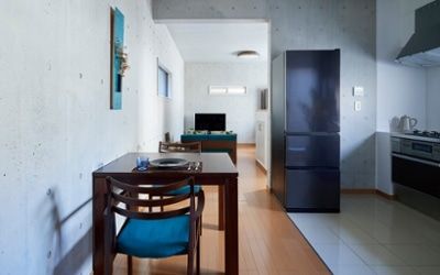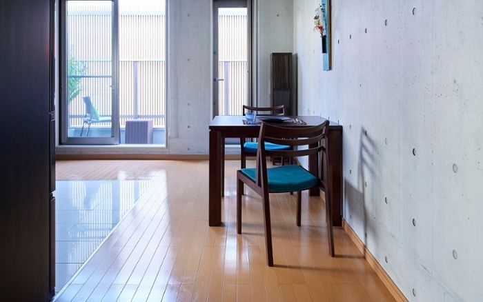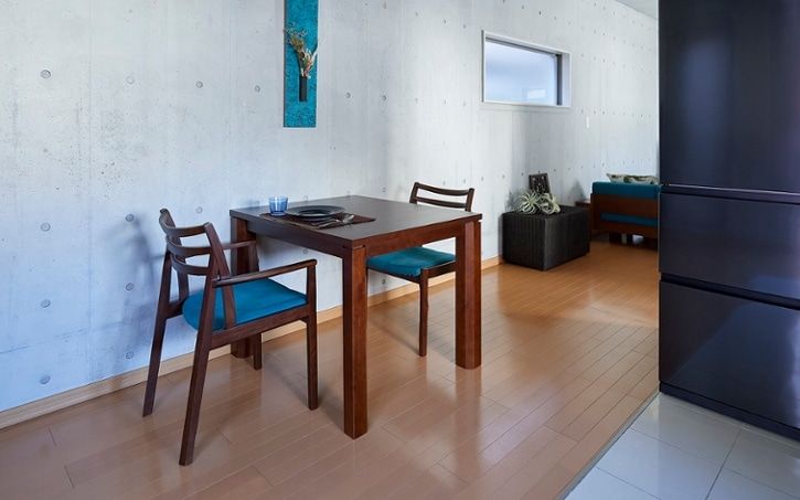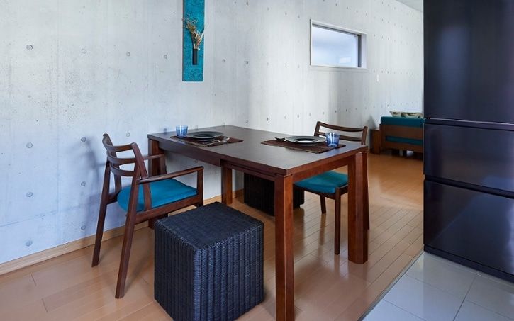 コンクリート打ちっぱなしの特徴的な雰囲気を活かした、一戸建てのアーバンリゾートなインテリア実例。一人暮らしに適したミニ戸建てのダイニングを、センス良く開放的に演出したレイアウトがポイントです。