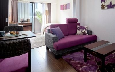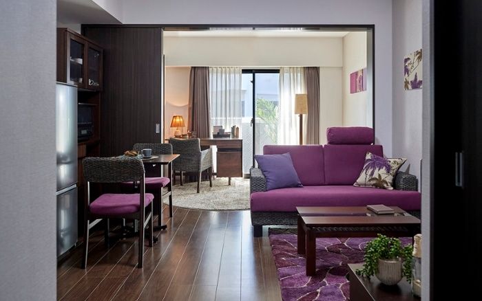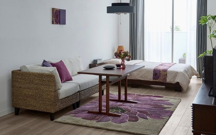 10畳の広さを活かした、大人女子のためのパープルインテリア実例。紫のファブリックが空間に品を添え、花柄のラグが華やかなアクセントを演出します。