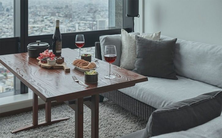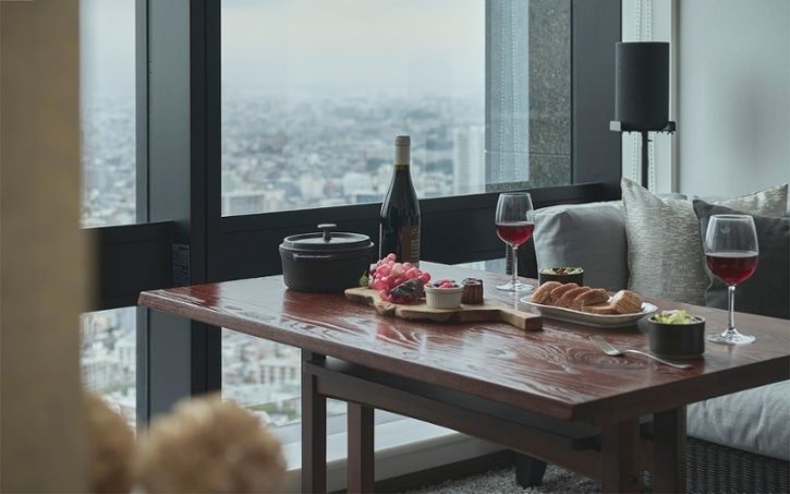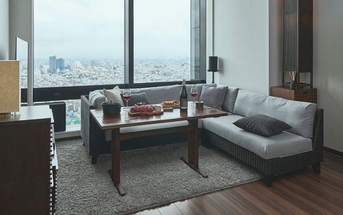 新宿の高層階からの絶景を背に、和モダンが息づく空間を叶えた外国人の方のインテリア実例。お家パーティーを自由に楽しめるソファダイニングのレイアウトが、友人を招いての楽しいひと時を叶えます。