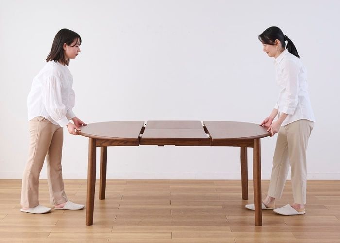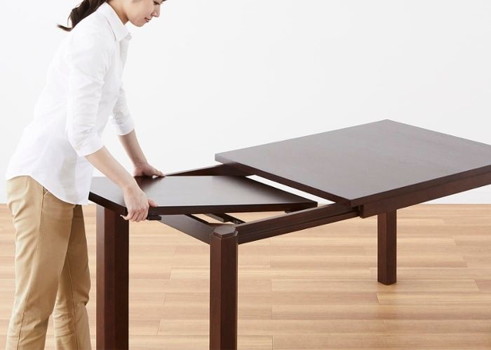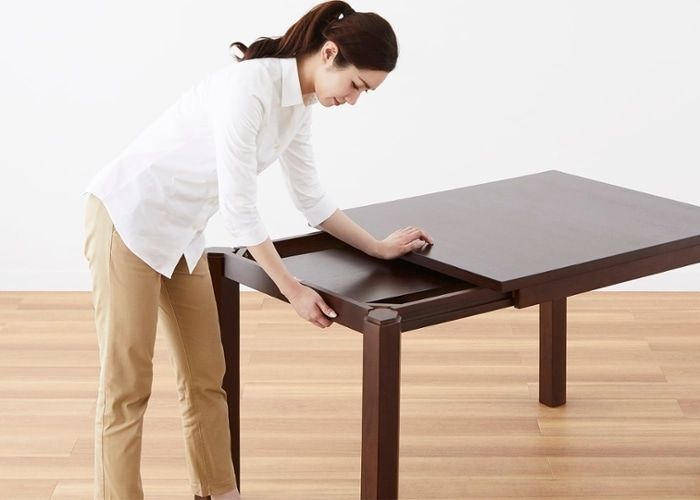 伸長用の板が天板の中に収納されており、女性1人でも簡単に広げることができます。