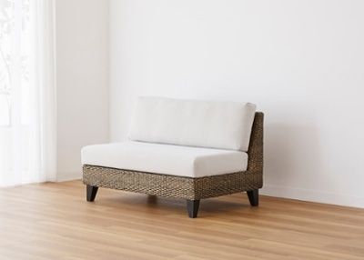 海沿いの爽やかなビーチスタイルをイメージしたコーディネート実例。リゾート感を楽しめるヒヤシンス素材の家具を取り入れることで、ビーチのような心地よさと自然の雰囲気に癒されます。