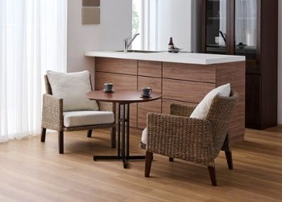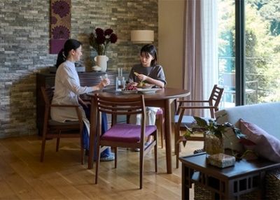 部屋のどこに置いても圧迫感がない、柔らかな円形デザインが特長。空間に優しげな印象をもたらすとともに、どの席からも相手の顔が見やすく、家族や友人との会話も弾みやすいダイニングを作れます。