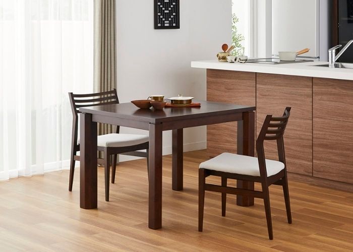 幅90〜120cm程度のダイニングテーブルは、2〜3人でもゆったり食事ができる大きめサイズ。来客時や作業スペースとしても十分な余裕があり、家族や友人との団らん、パソコン作業や趣味の時間など、様々なシーンで快適に使えます。