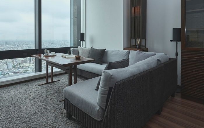 新宿の高層階からの絶景を背に、和モダンが息づく空間を叶えた外国人の方のインテリア実例です。シックで落ち着いたグレーのコーディネートが洗練された雰囲気を醸し出しています。