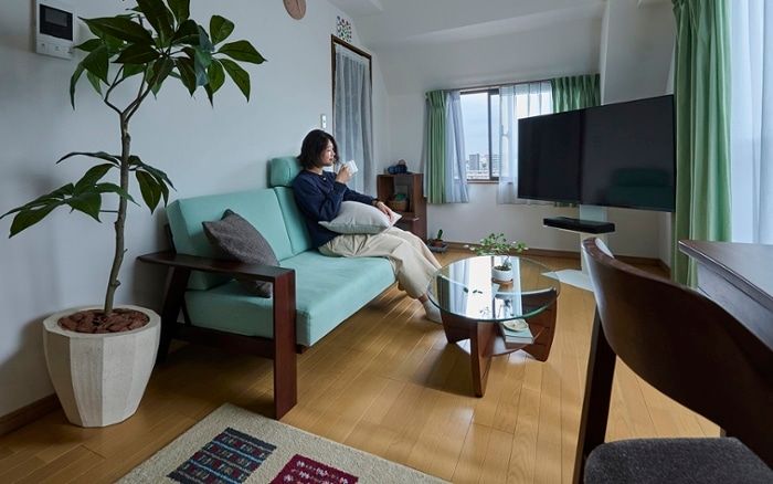 ソファでゆったりと寛ぐ一人暮らしの部屋