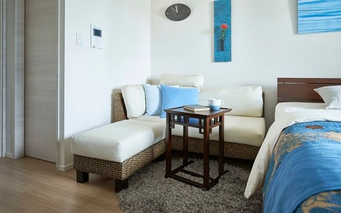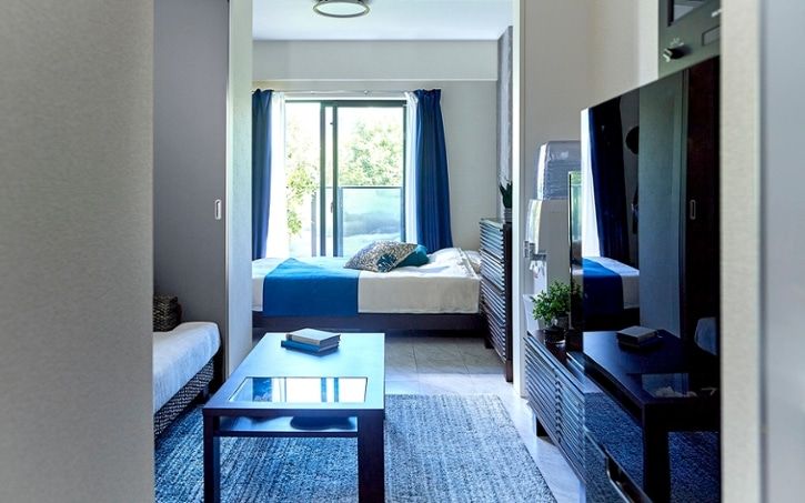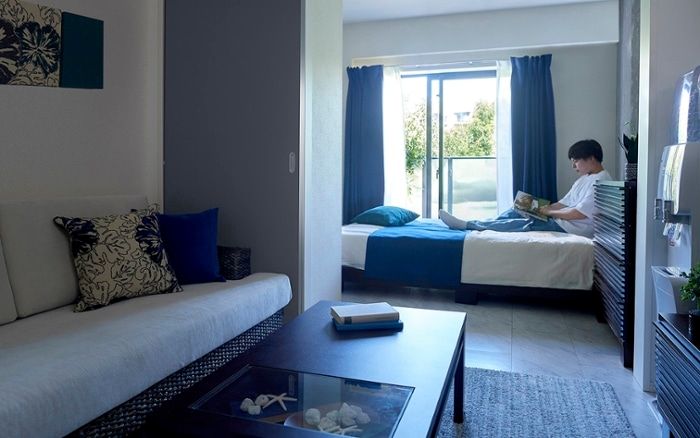 8畳のスペースを少しでも広く使えるように、シングルサイズのベッドやベンチタイプのソファを設置。それぞれ家具の横幅を抑えていますが、奥行きや座り心地、デザインをリゾートホテルにあるようなロースタイルに統一したことで、ゆったり寛げる空間を実現しています。