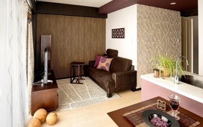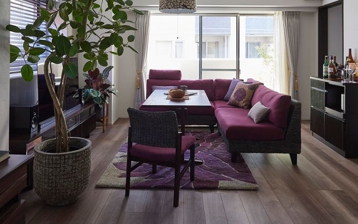 江の島の風を感じながら、一人暮らしの女性が自分だけの空間を楽しむインテリア実例。床色に合わせたダークブラウンの家具でまとめた空間に、海でのサンセットをイメージしたパープルをアクセントにした落ち着きがあるおしゃれな部屋は、日々の生活をリラックスして過ごすための理想的な空間です。