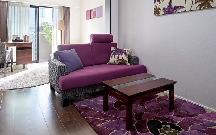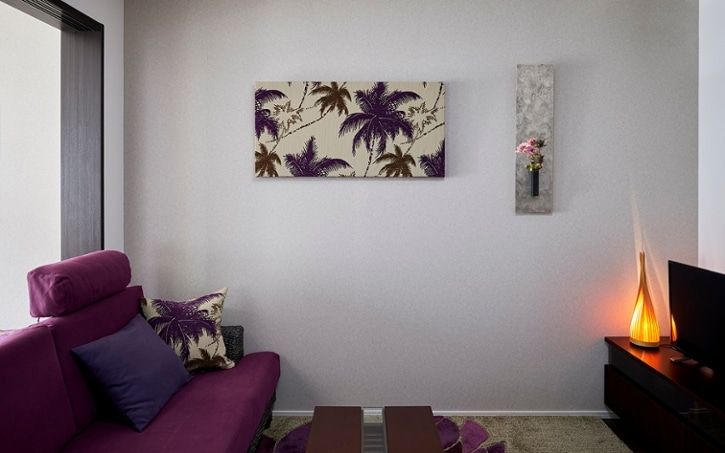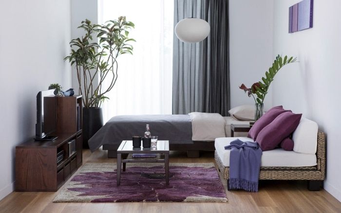 ワンルームを家具やファブリックでリゾートホテル風にコーディネートした実例。ヒヤシンスフレームのソファに華やかなパープルのラグや壁面装飾、窓辺に置いたグリーンが非日常感を演出しています。