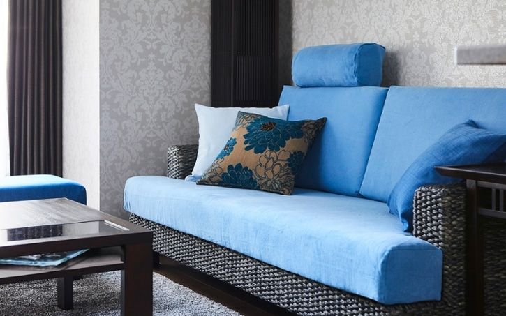 都会を一望できるタワーマンションの実例。高級感のあるアジアンテイストをテーマに、ブルーのスタイルをベースに統一感を意識して家具やインテリアを揃えています。バルコニーには屋外家具を設置し、夕日を眺めながら過ごすひとときは格別です。