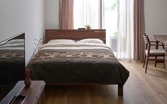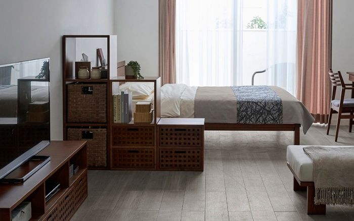 ユニット式の収納家具を活用したゾーニングで、寝室を賢くセパレート。壁のような仕切りで落ち着ける安眠空間が生まれます。生活感も隠せるため、一部屋でも癒やしのひとときを贅沢に味わえるレイアウトです。