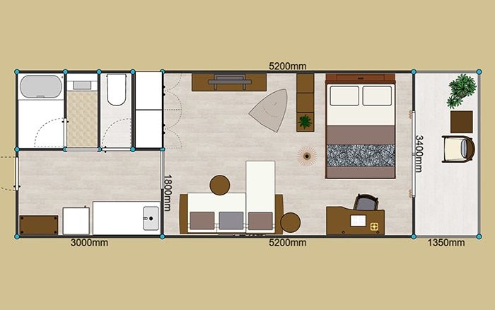 L字型の間取りを活かして、コンパクトなダイニングとリビングにはリゾート感を感じるL字型ソファを配置。7畳の寝室はダブルサイズのベッドで広々と就寝できます。