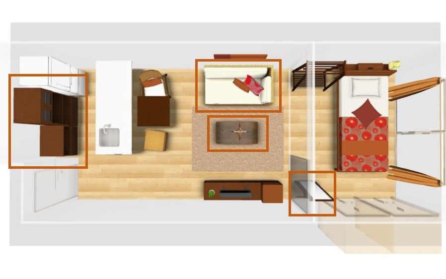 1LDKのお部屋に追加したのがオレンジ色の枠で囲んだ家具。