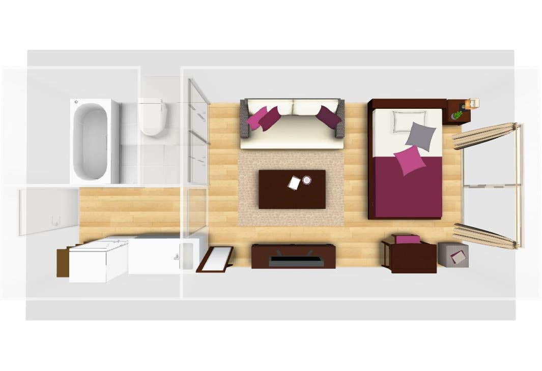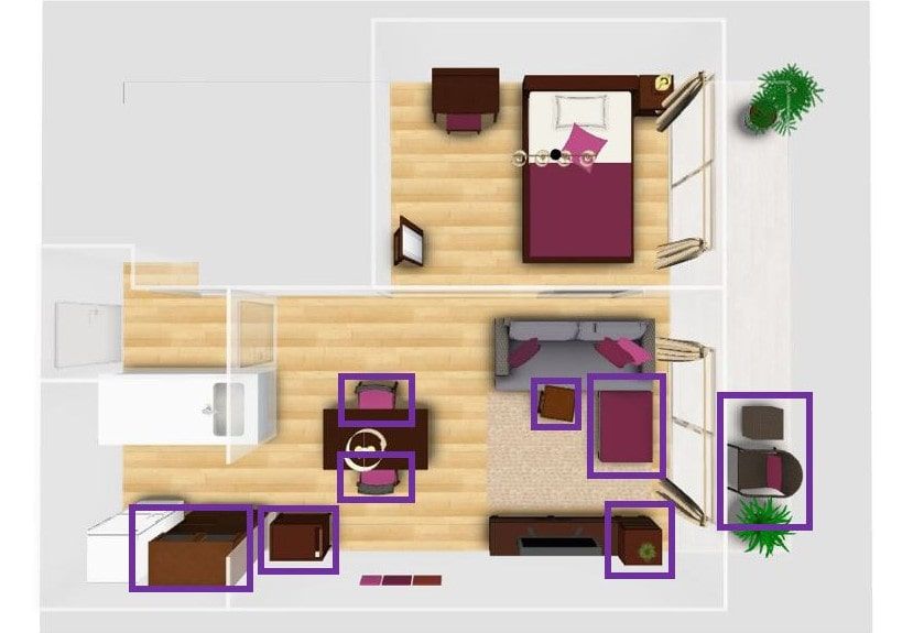 住み替えた1LDK(LD10畳+6畳)のレイアウト。紫の枠内商品が1LDK住み替え後に追加した家具です。