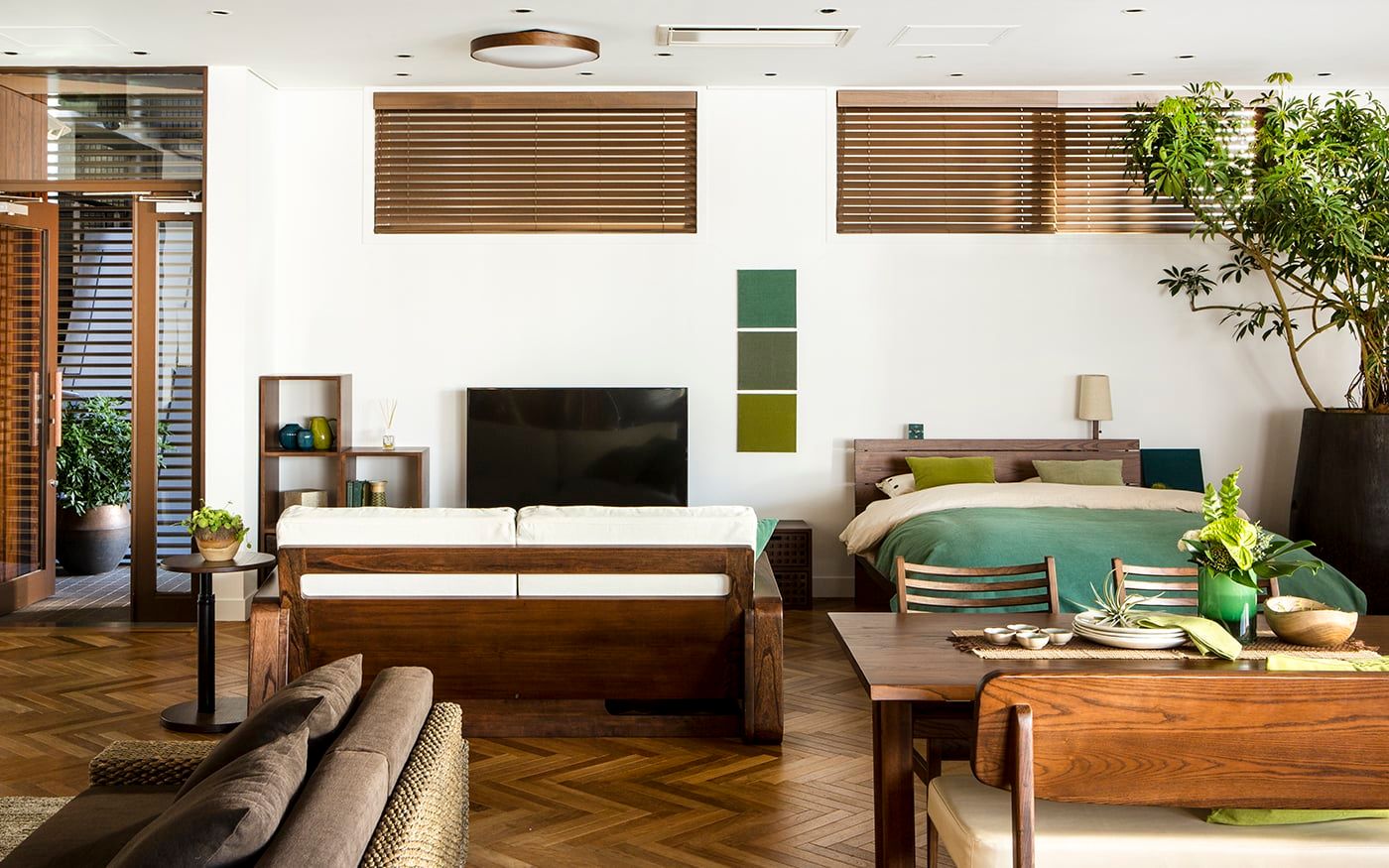 11. 和モダン(グリーン/ブラウン) × 無垢材家具(GB)