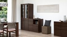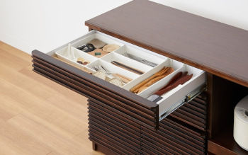 下段のみのキャビネットタイプもあります。シェルフタイプに比べて高さが低いため開放感を演出しやすく、狭い間取りにも取り入れやすいデザインです。また、キャビネットタイプを購入し、後日に別売りのシェルフパーツを付け足して拡張することも可能です。