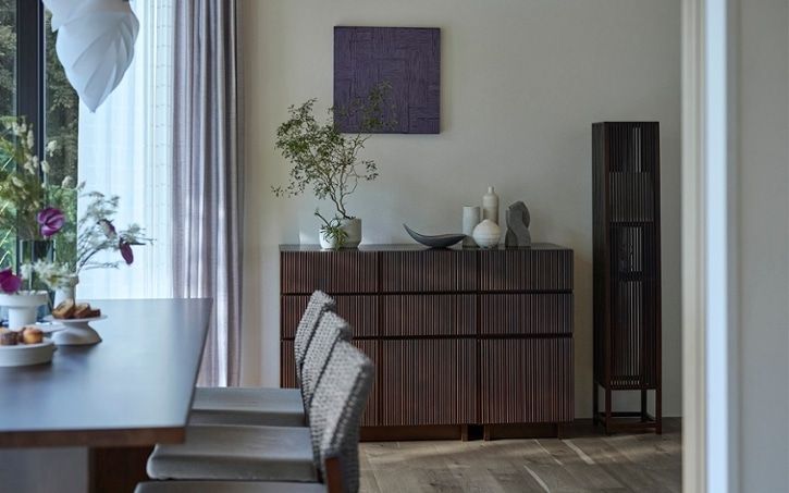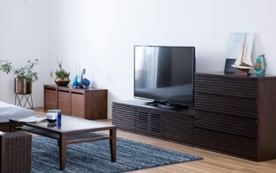 物を隠す収納のキャビネットは、家具が映えやすくおしゃれなデザインにこだわることができます。a.flatのおすすめは、穏やかな波を連想させるルーバーデザインのキャビネット。物を隠す収納でホテルのように生活感を感じさせない空間づくりができると同時に、程よいリラックス感も演出できるキャビネットです。