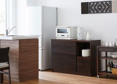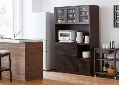 家電と食器をバランスよく収納できるキッチンボード。高さがあるため、幅がコンパクトなスペースにも十分な収納力を生み出すことができます。