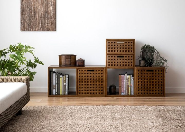 美しい格子柄と無垢材ならではの素材感。そして、サイズや形が自由自在に変えられるユニット式の拡張性が魅力のユニットキューブ収納。収納棚としてはもちろん、飾り棚や間仕切りなど様々な用途で活躍します。