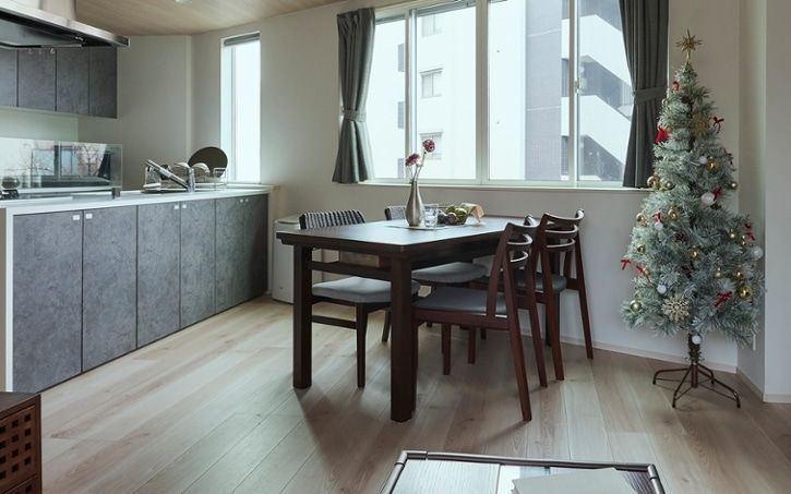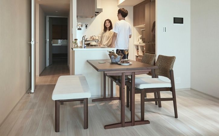 スタンダードな配置のキッチンに寄せたダイニングテーブル。ロースタイルのダイニングを選ぶことで、コンパクトなスペースでも天井を高く見せて、開放感のある雰囲気に魅せることができます。
