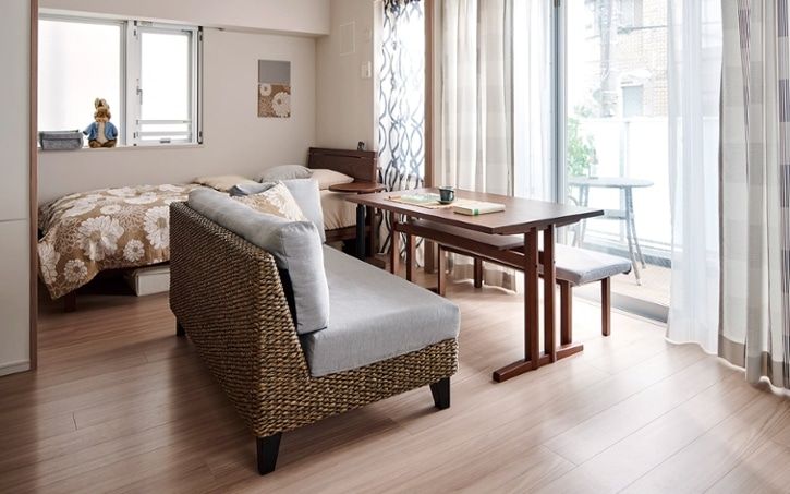 ワンルーム全体を温もりある無垢材の家具で統一した空間。ソファサイドには、収納力の高い引き出し付きのサイドテーブルを取り入れて、限りあるスペースの中でも整理整頓がしやすい空間づくりを行っています。