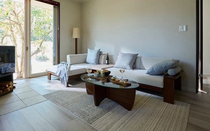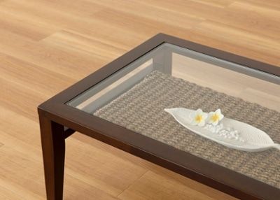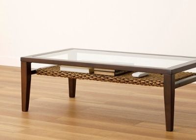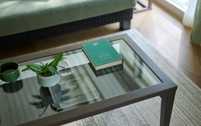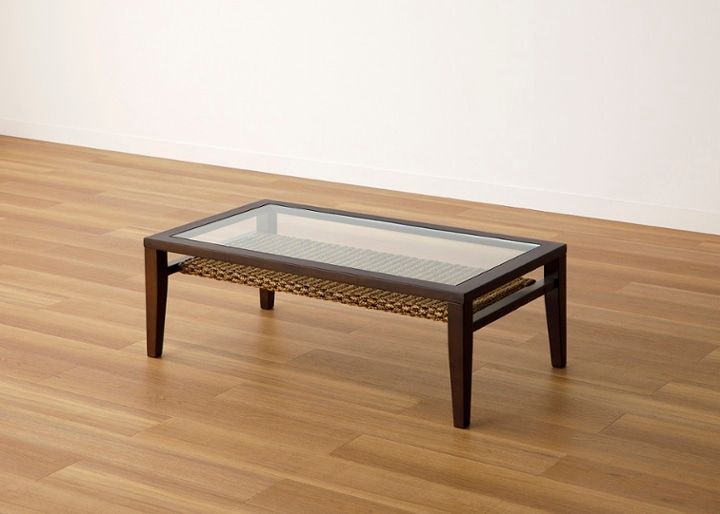 リビングに置くソファテーブルに、ディスプレイ棚付きのものをセレクト。ガラス越しにラタン素材や自然を連想させる小物がのぞき見え、まるでリゾートにいるような非日常を味わうことができます。