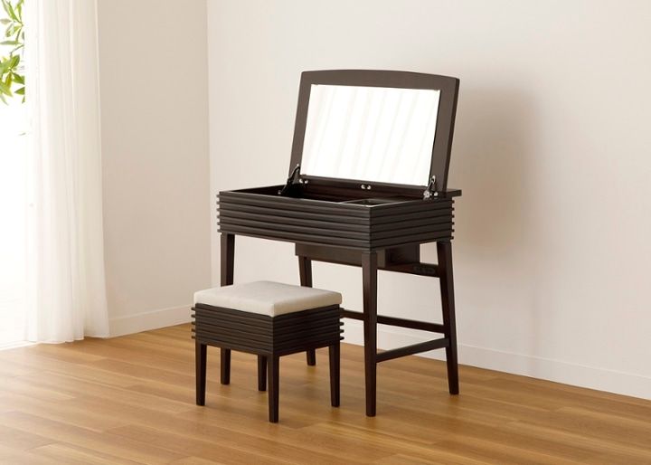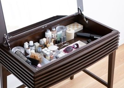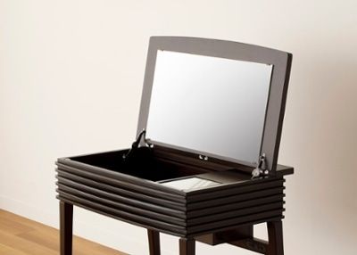 天板の裏側に鏡がついており、開くとドレッサーになるタイプ。普段はテーブルやデスクとしても使うことができるので、一台二役の便利なテーブルです。