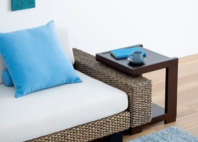 ソファと収納付きのサイドテーブルを置いたリビング。ソファの手前にオットマンとローテーブルの両方を置くとスペースが狭くなるため、コンパクトなサイドテーブルを取り入れたことで、のんびり寛げる空間に。
