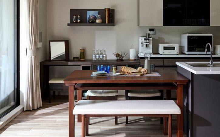 コンパクトな空間を有効活用するため、食事と寛ぎをひとつにまとめたソファダイニングスタイルを取り入れた実例。片側をソファ、もう片側を背もたれの無いベンチにしたことで、空間を開放的に見せています。