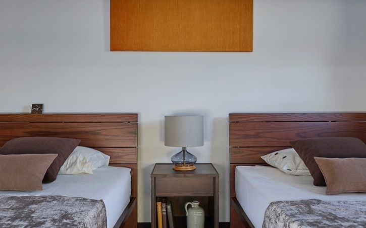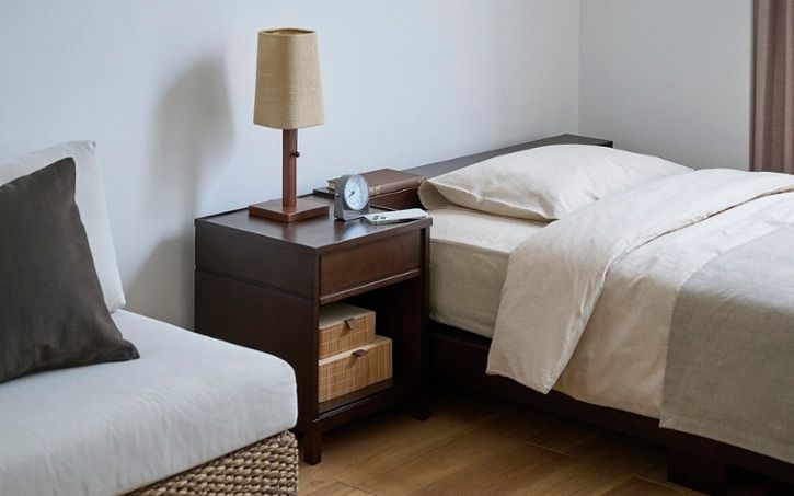 ベッドの横に収納付きサイドテーブルをレイアウト。おしゃれなテーブルランプを置いたり、収納スペースにお気に入りの本を置いたりすることで寝室でのひと時をより快適なものにすることができるでしょう。