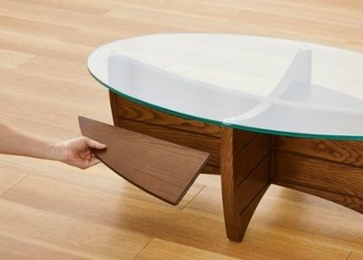 セイル・サイドテーブルは天板の溝に落とし込むだけのシンプルな構造。収納棚から手を入れて指で天板を押し上げるだけで、簡単に取り外しでき、ガラス天板から人工大理石の天板にパーツ変えすることも可能です。