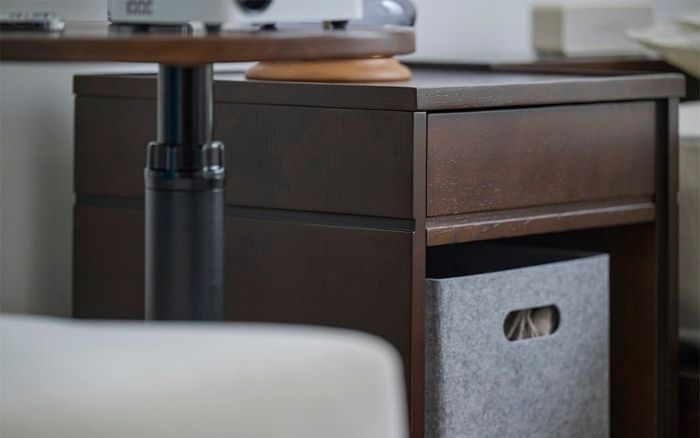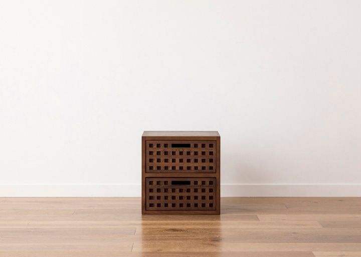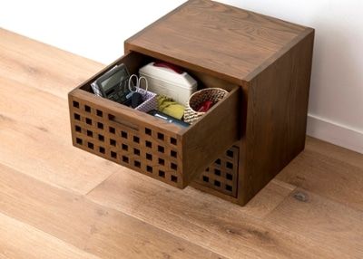 別売りの引き出しを追加すれば、隠す収納に早変わり。引き出しパーツは、無垢材・ダークブラウンのラタン・グレインブラウンのラタンの3つから選べます。