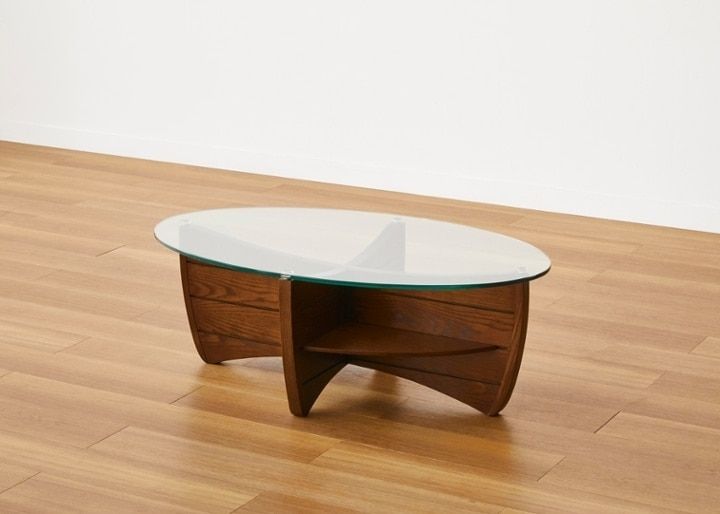 グレーカラーで統一したコーディネートに映える、ガラス天板のローテーブル。すっきりとした印象を際立たせてくれると同時に、優しい弧を描くオーバル型は空間にリラックス感も与えてくれます。