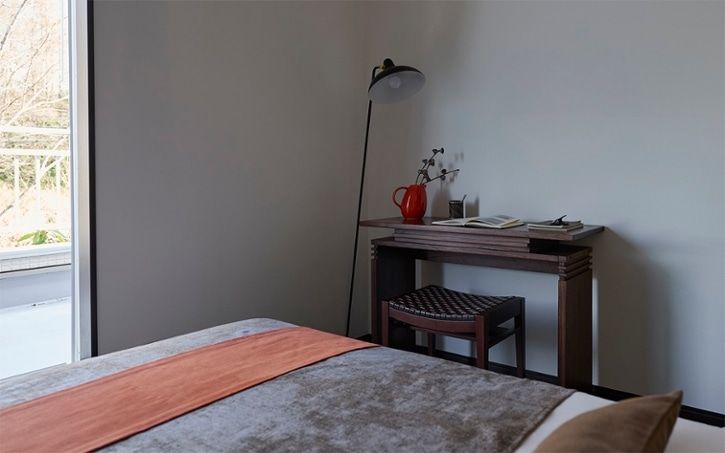 寝室の片隅に引き出し付きのコンソールテーブルとスツールを置き、簡易デスクとして使用した実例。狭いスペースですが大きく空いてしまった壁面に家具を置くことで、全体のバランスが整いおしゃれに見えます。