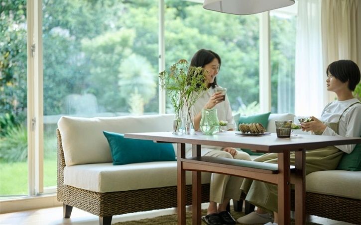 ローテーブルでロースタイルにまとめるだけでなく、ソファダイニングスタイルという選択肢もあります。