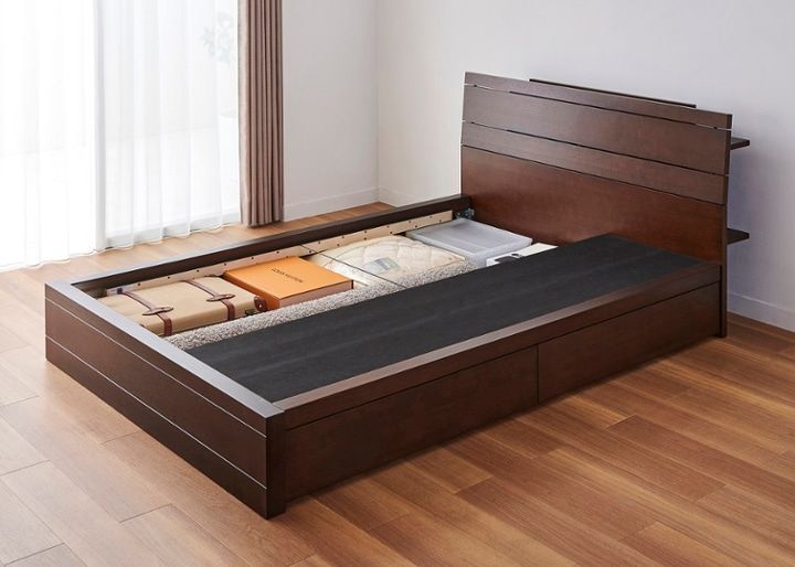 ラック・ベッドは、引出だけでなく、その反対側に「オープンスペース」を設けています。季節物のラグ、スノボやゴルフアイテム、大きめの収納箱や布団類など、収納場所に困る長くて大きな物が自由に収納できます。また、引出とオープンスペースの左右の位置は、寝室の間取りに合わせて選べます。