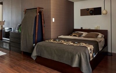 リゾートホテルのような、開放的で心地良い雰囲気を自宅のベッドルームで再現したいなら、高さを抑えたデザインのローベッドがおすすめ。天井を高く見せてくれる効果があり、非日常感のあるコーディネートを叶えてくれます。