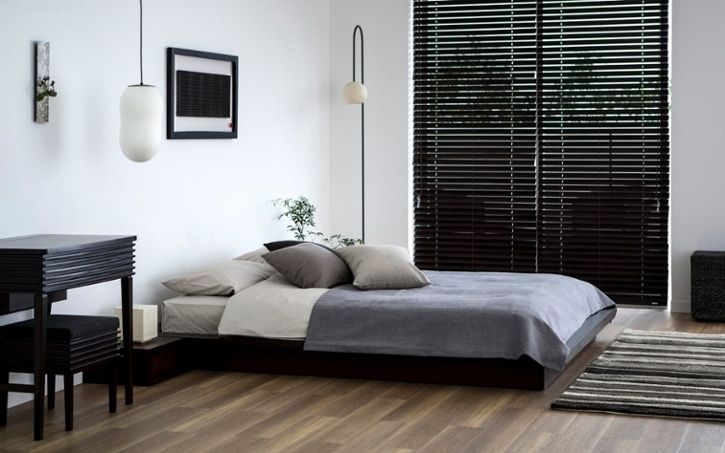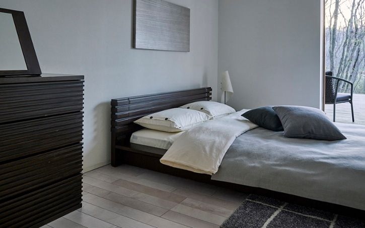 ローベッドを主役にした寝室では、空間にゆとりが生まれて開放感を楽しめるのが大きな魅力。一般的な天井高240cmの部屋でも、天井が高く見えるため、日本の住空間と好相性と言えます。