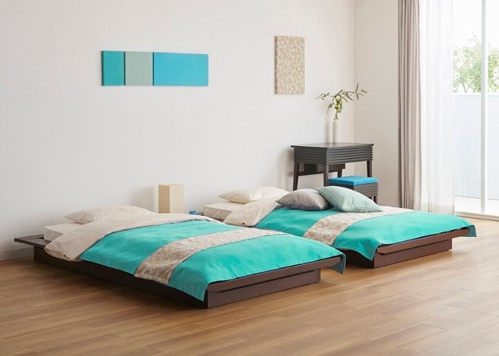 すっきりとしたシンプルなデザインのベッドなので、シングルを2台置きしても、風が通り抜けるような開放感のある寝室に仕上がります。複数台ベッドを置くケースや、広く見える寝室づくりを目指したい方におすすめです。(写真はv02シングルを2台を離したツイン使い)