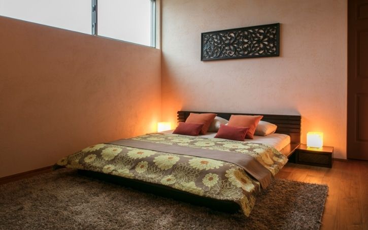 建具や壁面などの内装までとことんこだわったアジアンムード漂う寝室。温もりある土壁やベッド脇に添えた間接照明など非日常感のある空気の中で、ベッドのルーバーデザインや低いデザインが上手く馴染んでいます。