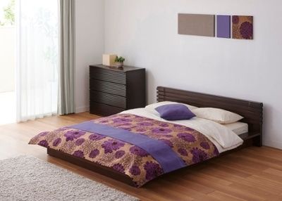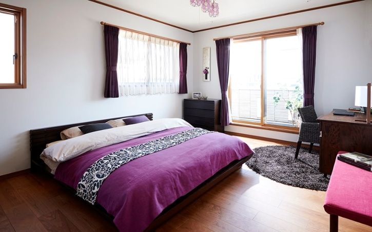 9畳というゆったりとした寝室なので、ベッド以外にもデスクなどの家具を多く配置していますが、ローベッドを選んでいるため圧迫感を感じさせません。パープルとダークブラウンの色合いがエレガントな印象です。