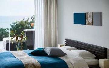 海沿いの爽快感を味わえるようなビーチテイストでまとめた寝室コーディネート例。開放感のあるコト・ローベッドに、澄んだ色合いが魅力のターコイズブルーやエメラルドが綺麗に映えています。