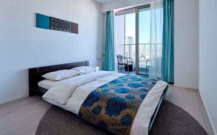 タワーマンションという高級感のあるロケーション。窓の外に広がる景色を生かすために、コト・ローベッドを採用して眺望を活かした寝室作りを行っています。また、ブルーの差し色で爽やかに過ごせそうですね。