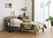 静かなリゾートの朝をテーマに、無垢材と相性のよい多彩なグリーンとヤシ柄を組み合わせたコーディネート。シンプルでありながら存在感のあるデザインのムク・ベッドだからこそ、個性的なテイストとも調和します。
